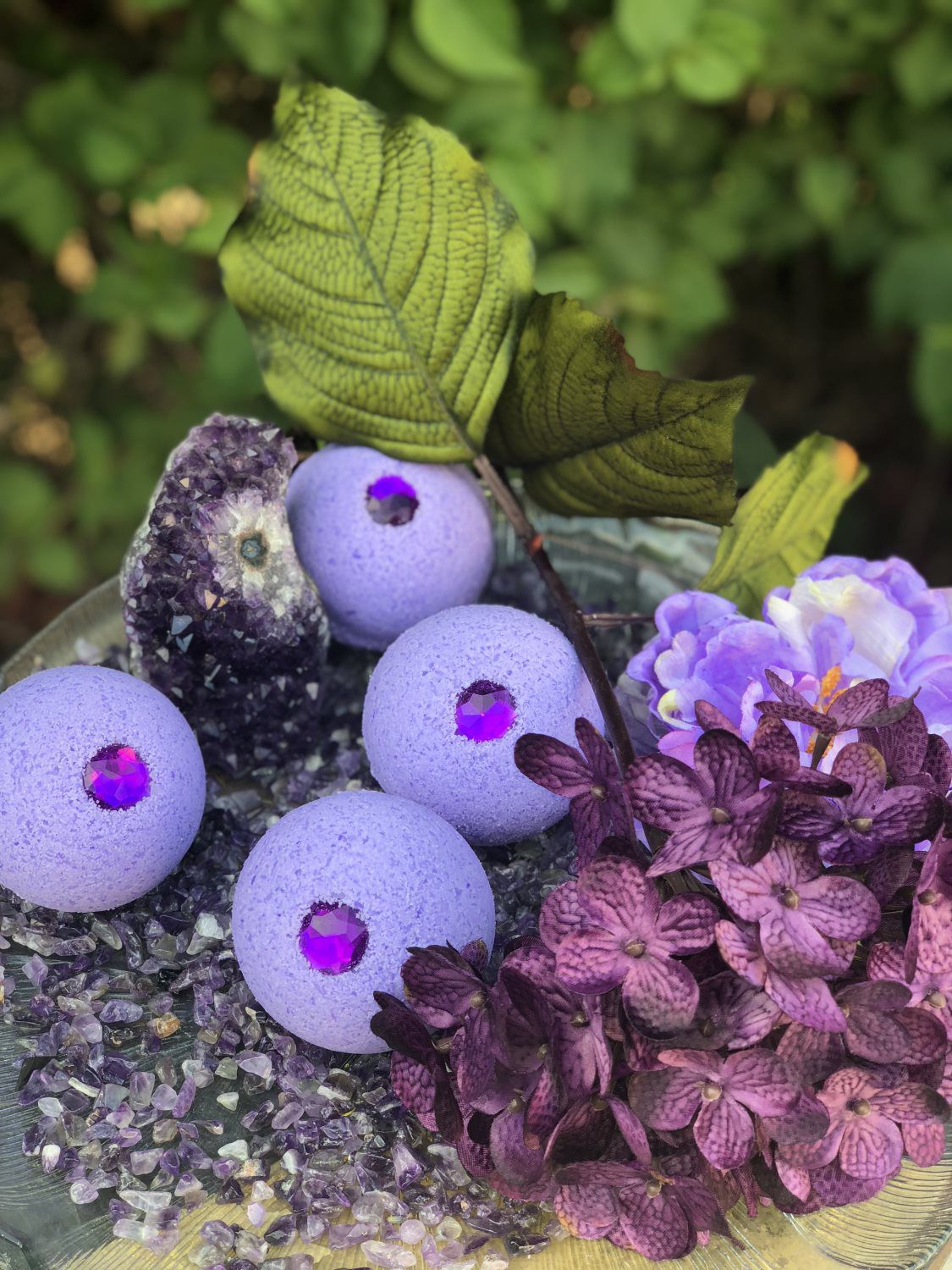 The JANA Bomb Blast is a rich, romantic, and luxurious scent. This is a Bomb Blast that makes you feel beautiful. Delicate white and red roses, heady jasmine and spicy carnations blend with juicy melon and ripe plums, culminate to a sensual finish of precious woods and warming amber. Inside you find a real Amethyst stone to meditate associated with the Crown Chakra.