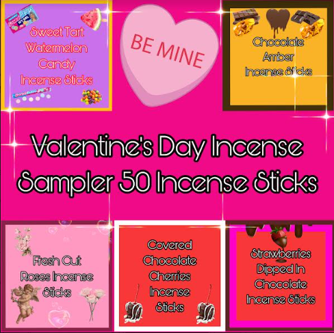 Indulge in our Valentines Day Incense Sampler. Our top five sweetheart incense pack includes chocolate covered cherries, chocolate amber, fresh cut roses, sweet tart watermelon candy and strawberries dipped in chocolate incense sticks.
